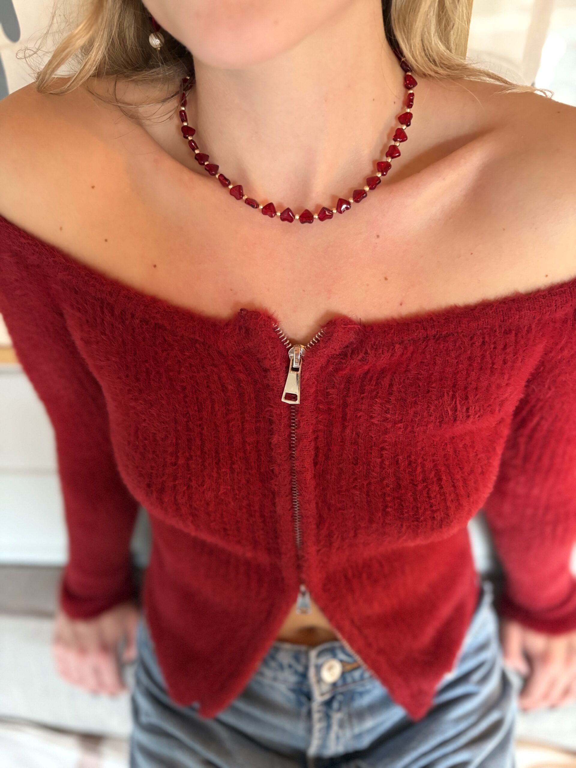 Handmade Necklace With Heart-Shaped Wine Red Beads Mixed With Gold Details, On A Stainless Steel Wire