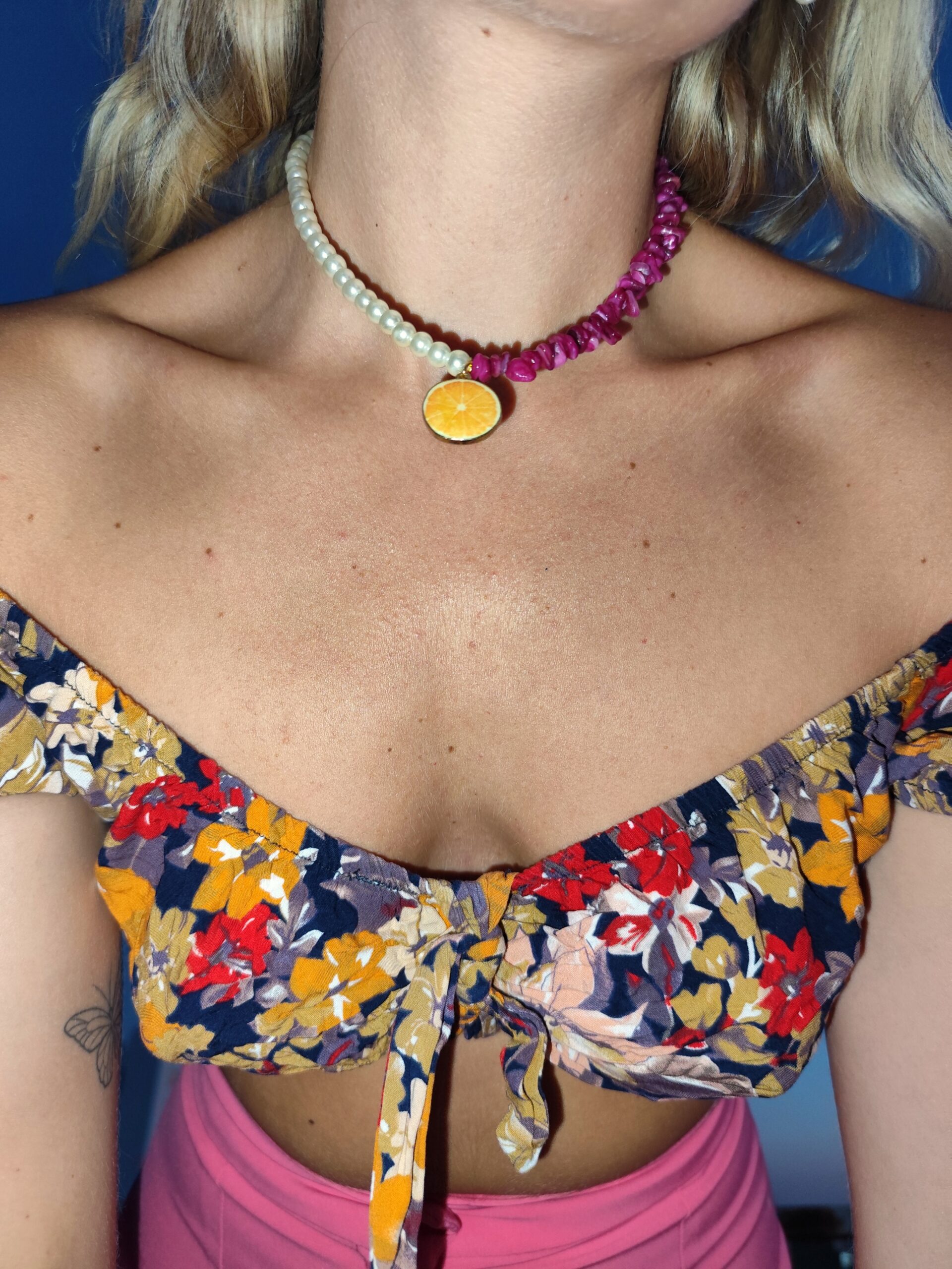 Handmade Necklace With Pearls Combined With Cute Little Lemon Beads, On A Stainless Steel Wire