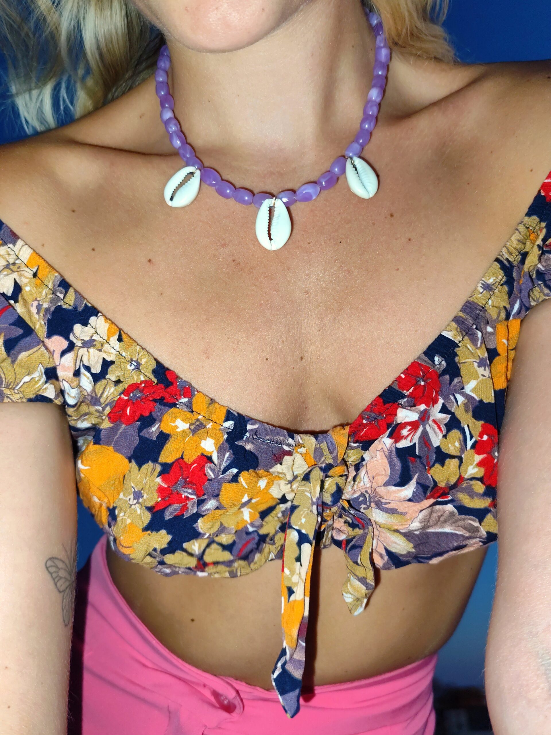 Handmade Necklace With Lilac Ceramic Beads And Shells, On A Stainless Steel Wire