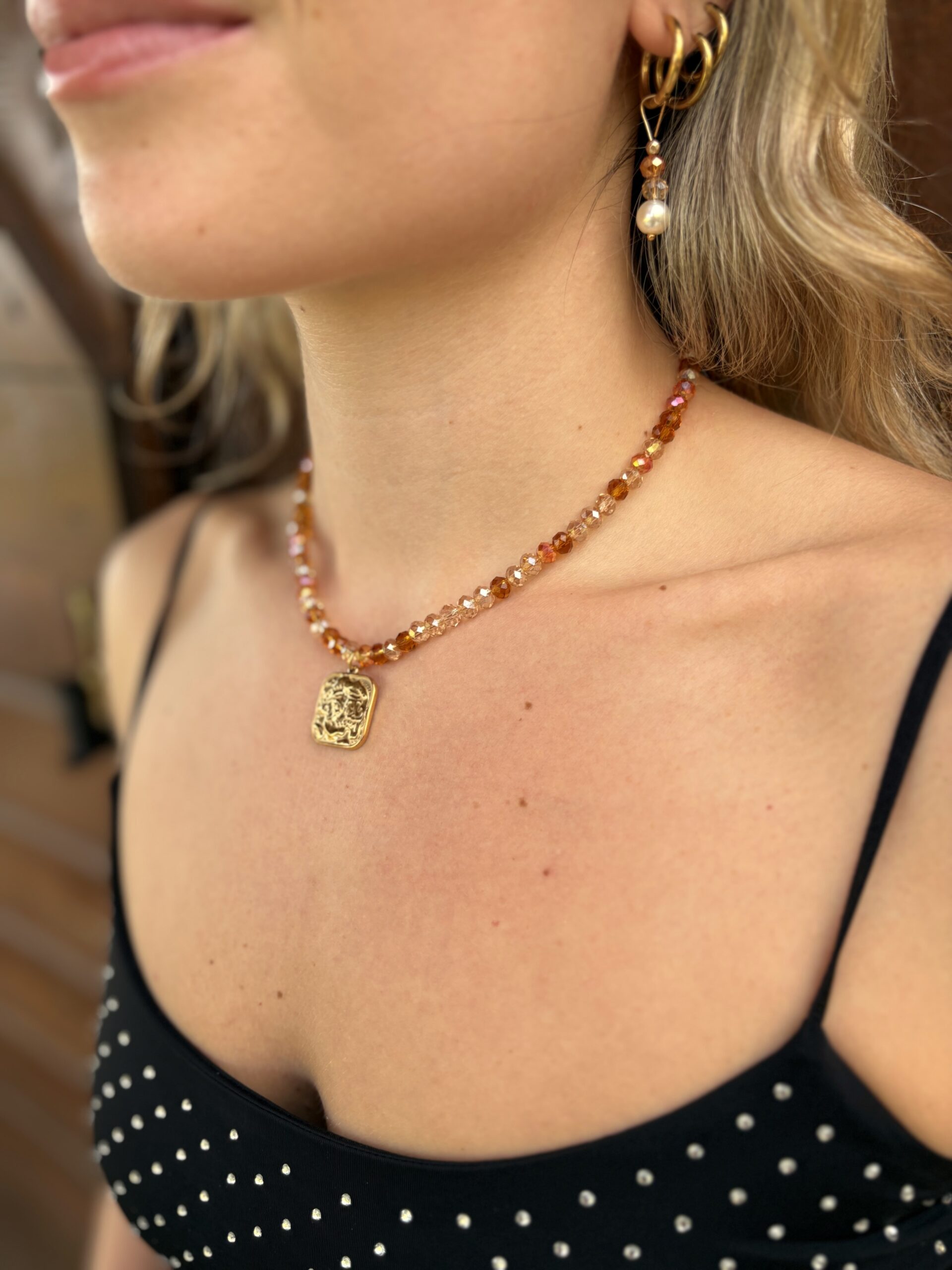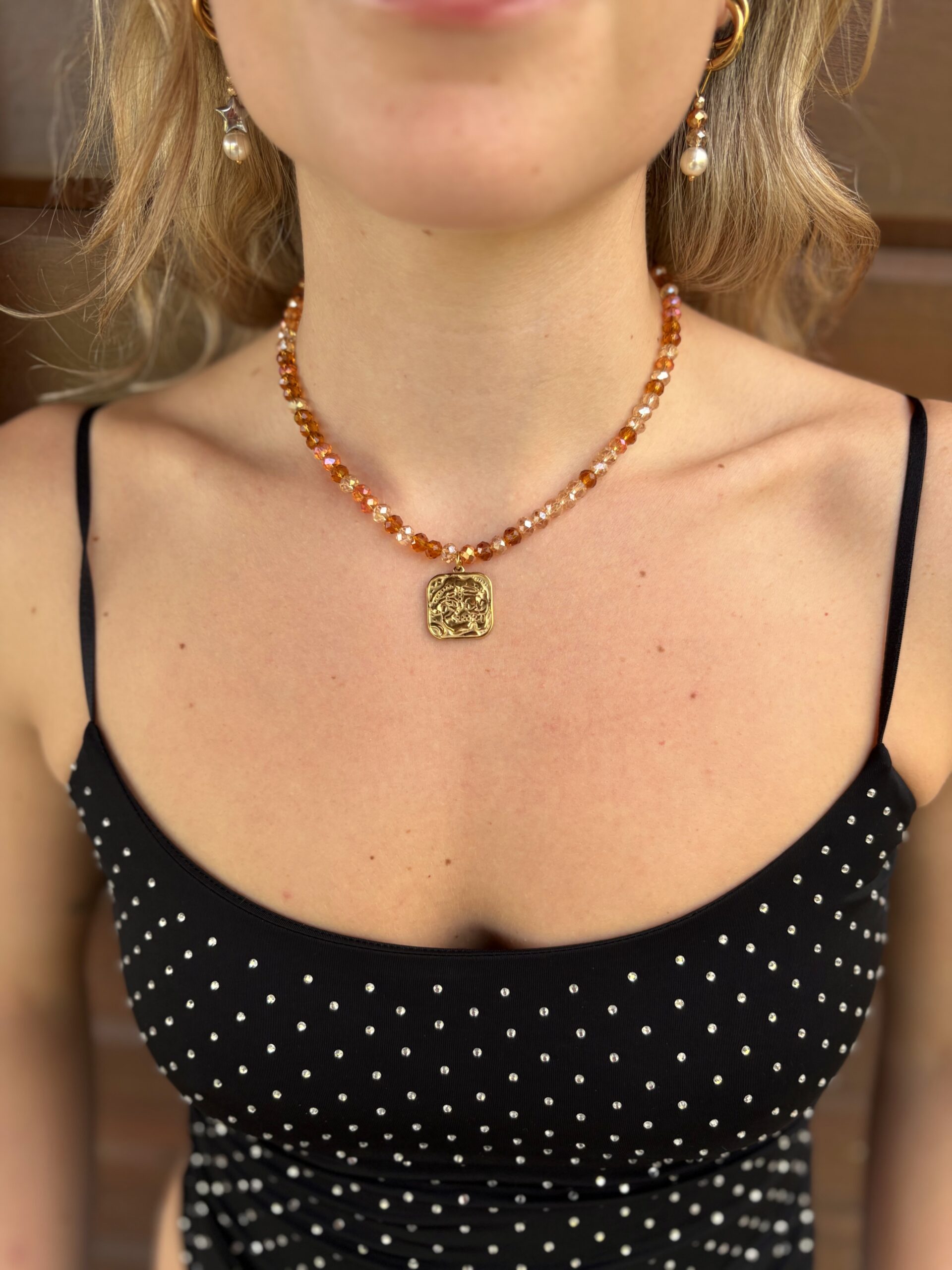 Handmade Necklace With Orange Tone Beads And A Stainless Steel Centerpiece, On A Stainless Steel Wire