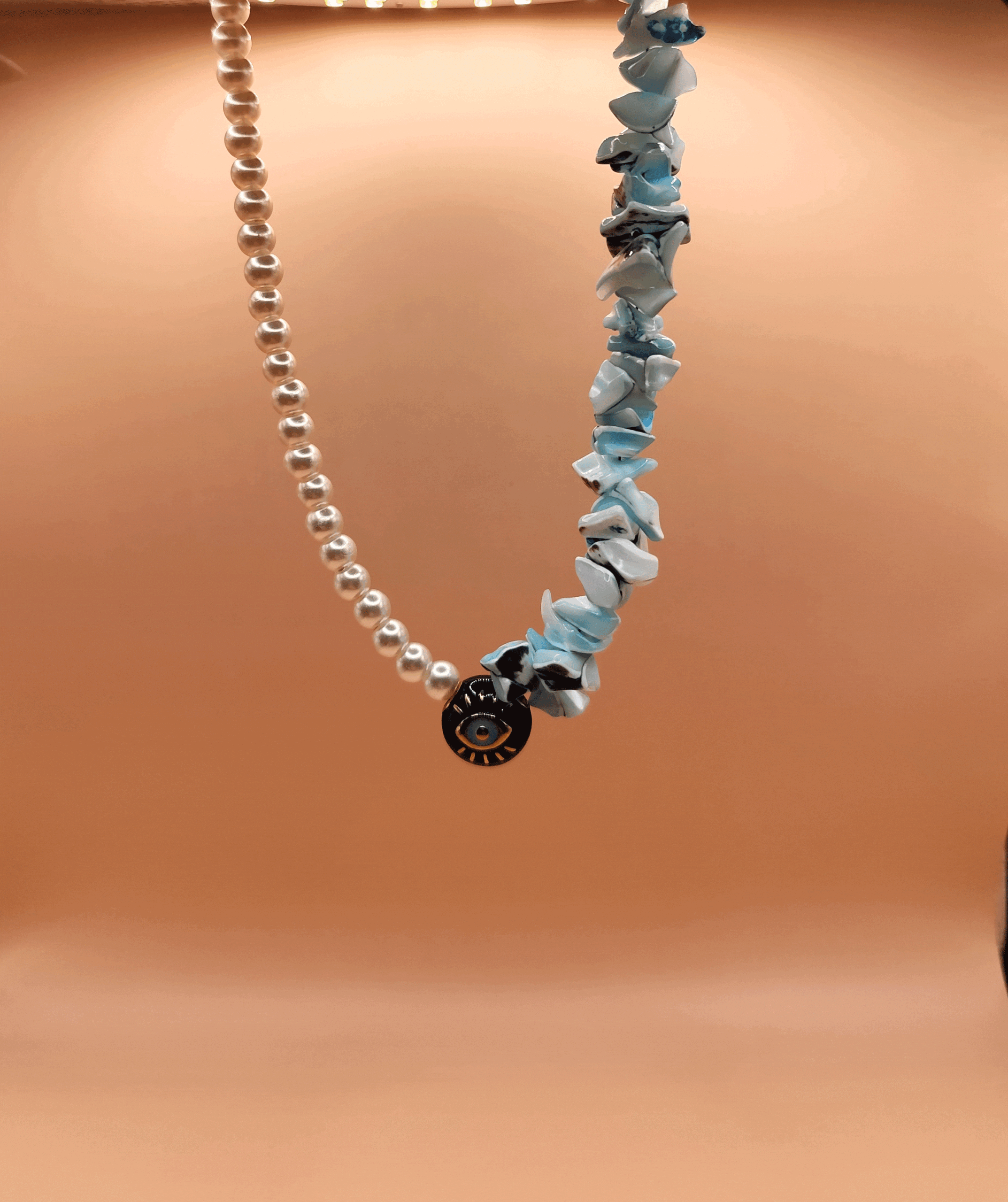 Handmade Necklace Made Of Half Aquamarine Shell Chips, Half Pearls Featuring A Stainless Steel Evil Eye Element In The Center, On A Stainless Steel Wire