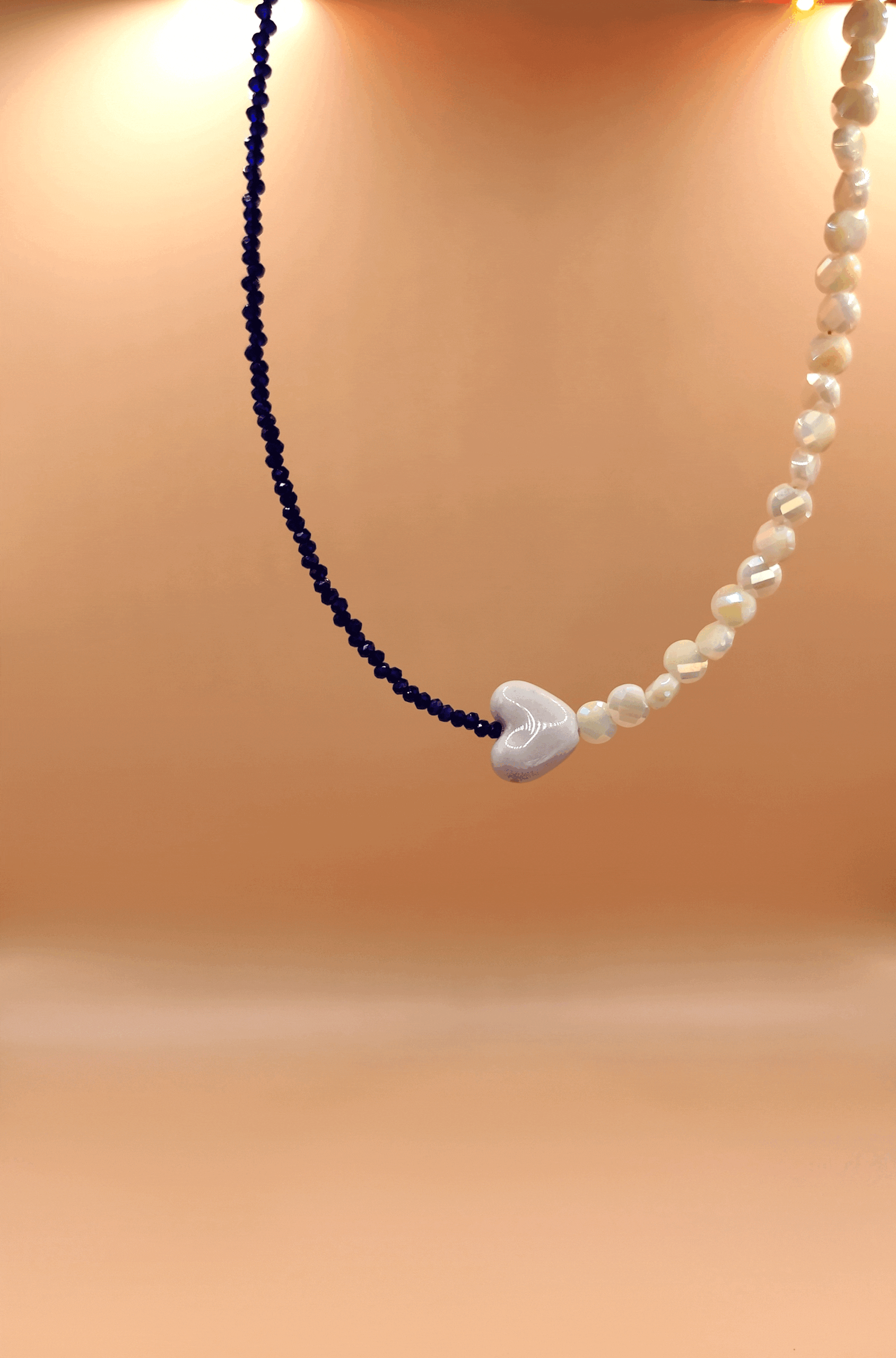 Handmade Necklace With Half White Beads, Half Electric Blue Beads Featuring A Heart Detail In The Middle, On A Stainless Steel Wire